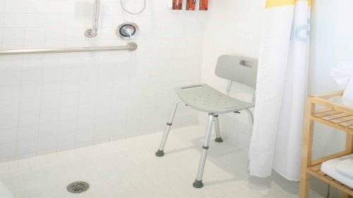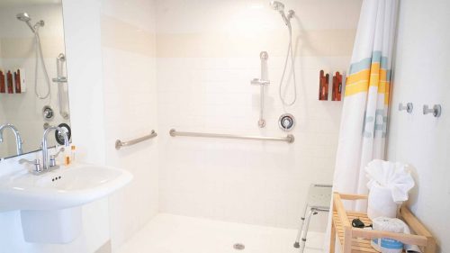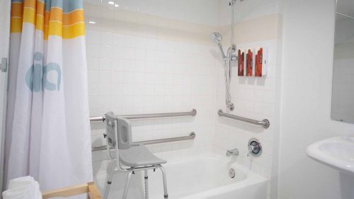 - Una selección de dos baños: Ducha adaptada para silla de ruedas con 3 barras de apoyo, un asiento de ducha desmontable y una regadera de mano o una tina con 3 barras de apoyo, un asiento de ducha desmontable y un asiento de ducha montado en la pared. Favor de indicar su elección al reservar.