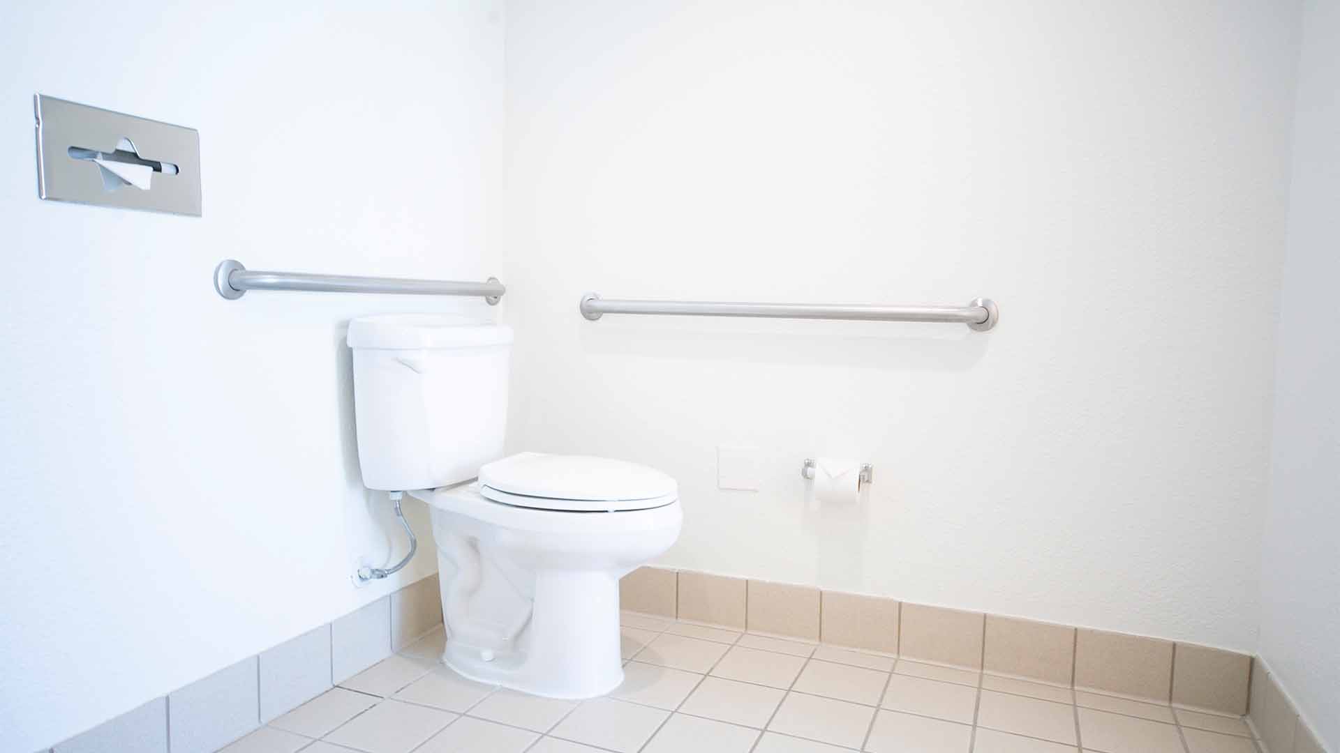 - Los baños tienen lavamanos con estantes a baja altura, manijas de palanca, espejos a baja altura, amplio espacio alrededor de la taza y 2 barras de apoyo alrededor de la taza.
