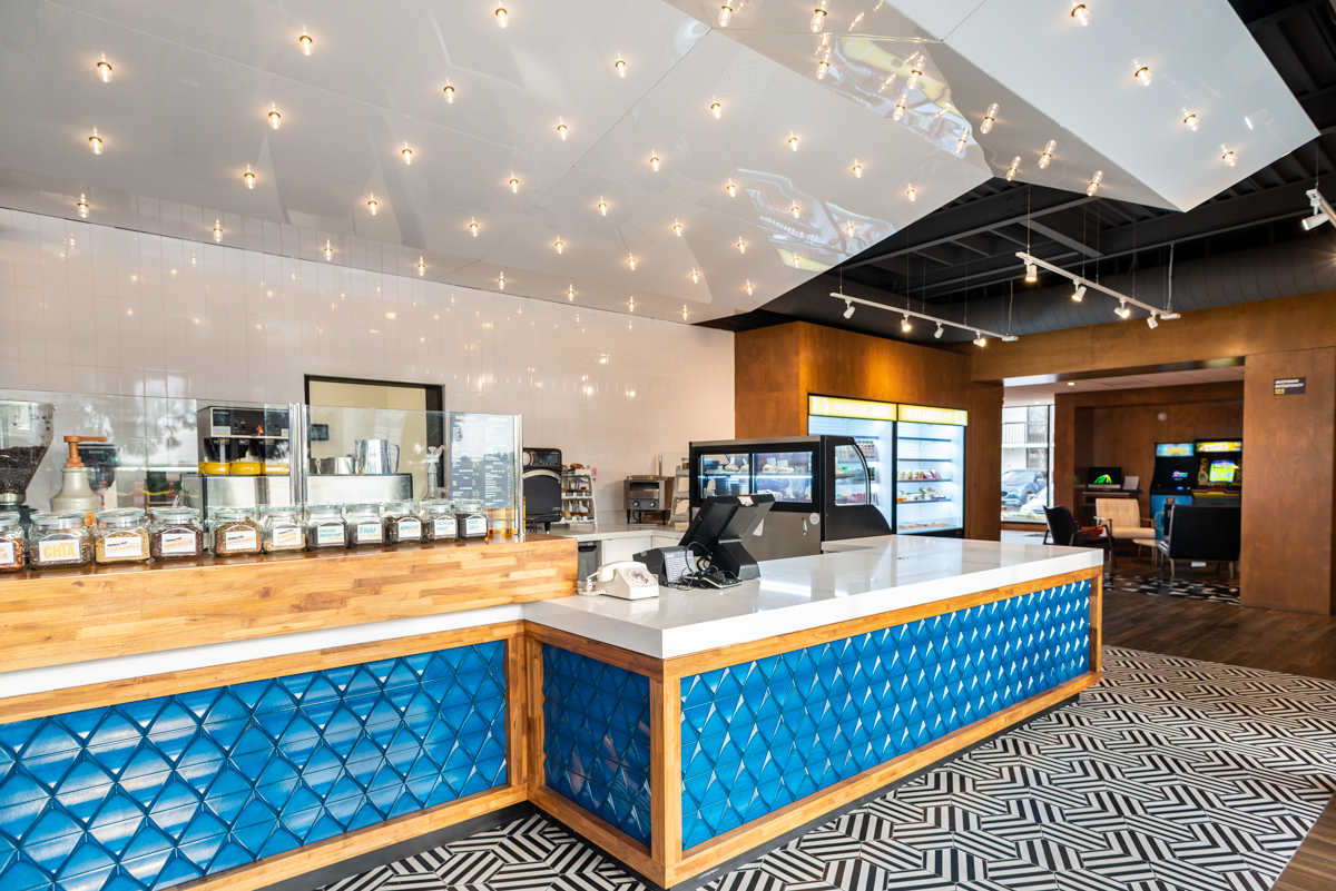 - Café con mostradores y entradas accesibles. Se puede acceder el café desde la recepción y las entradas de la calle.